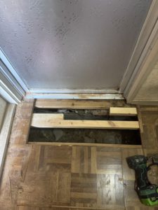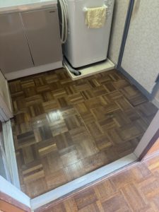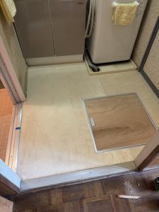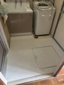 今回は床下に補強用で現地加工した木材を使用し、その上から下地木材を脱衣所全体に敷き詰めました。